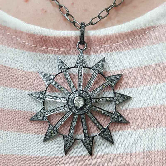 925 Solid Sterling Silver Natural Pave Diamond Handmade Sunburst Pendant, Unique Sunburst Pendant, wedding Gift