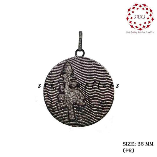 Round Disk With Tree Designer Pave Diamond Silver Pendant, Round Shape Disk Pendant, Silver Jewelry