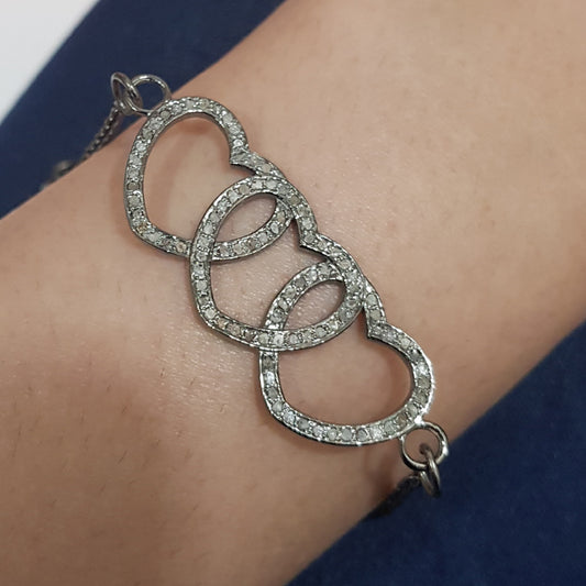 Three Heart Lovely Designed with Natural Pave Diamond Silver Black Connector, Silver Jewelry