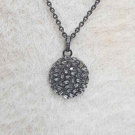Baguette Stone And Pave Diamond Handmade Designer Small Round Pendant, Minimal Necklace, Silver Jewelry