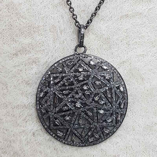 Baguette & Pave Diamond Designer Round Pendant, Fancy Round Design Necklace, Gift For Lovers
