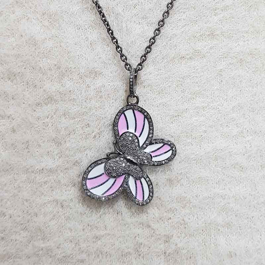Unique Butterfly Style Pave Diamond Handmade Designer Enamel Pendant, Birthday Gift, Gift For Princess, Cutest Pink White Butterfly Enamel Necklace