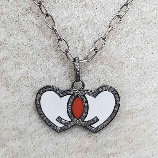 Beautifully Designed Joined Heart Pave Diamond Enamel Pendant, Cutest Gift For Lovers, Valentine's Day Gift