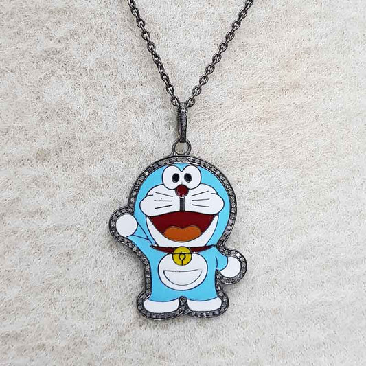 Gorgeous Doremon Turquoise And White Enamel Pave Diamond Fancy Designer Pendant, Gift For Someone, Children's Gift, Silver Jewelry