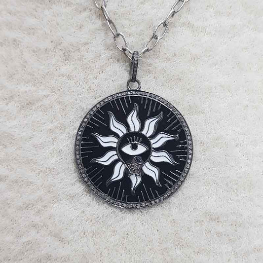 Round Designer Black Enamel Evil Eye With Sunburst Pendant, Stunning Sunburst Necklace