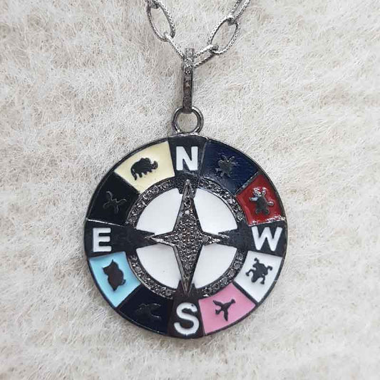 Direction Based Pave Diamond Round Disk Multi Charm With Enamel Pendant, Gift For Special One
