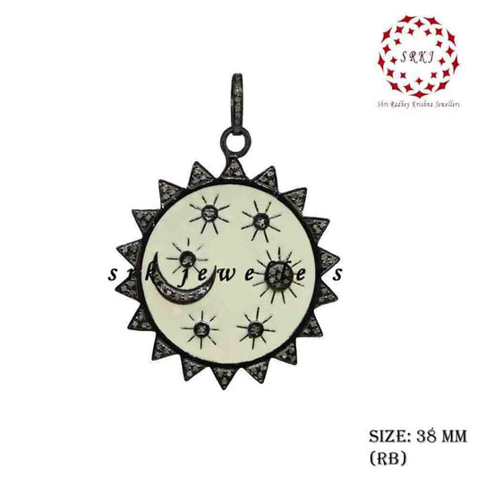 Fancy Designer Round Sunburst Pave Diamond 925 Sterling Silver Enamel Pendant, Silver Jewelry