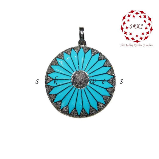 Round 925 Sterling Silver Handmade Pave Diamond Turquoise Enamel Flower Pendant, Anniversary Gift