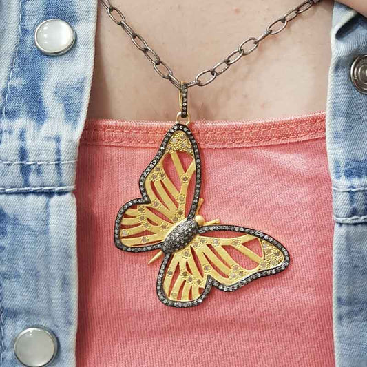 Silver And Golden Designer Pave Diamond Handmade Designer Butterfly Pendant, Attractive Flower Pendant, silver Jewelry
