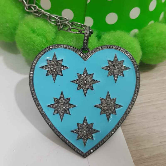 Turquoise Enamel 925 Sterling Silver Handmade Heart Star Pendant, Valentine Gift