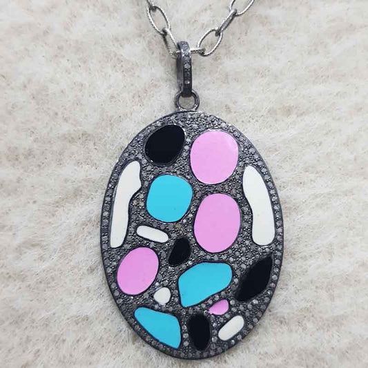 Oval Pendant With Multi Enamel And Pave Diamond Layers, Unique Oval Shape, Gift For Favorite one