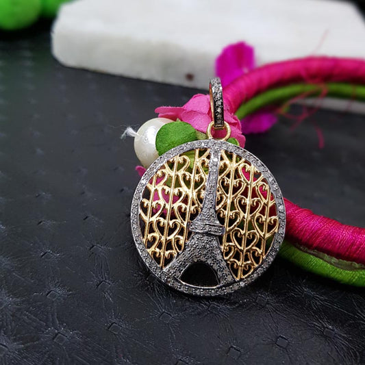 City of Lights Eiffel Tower Pendant, Round Designer Fancy Eiffel Tower Style Pendent With Pave Diamond, Silver Jewelry