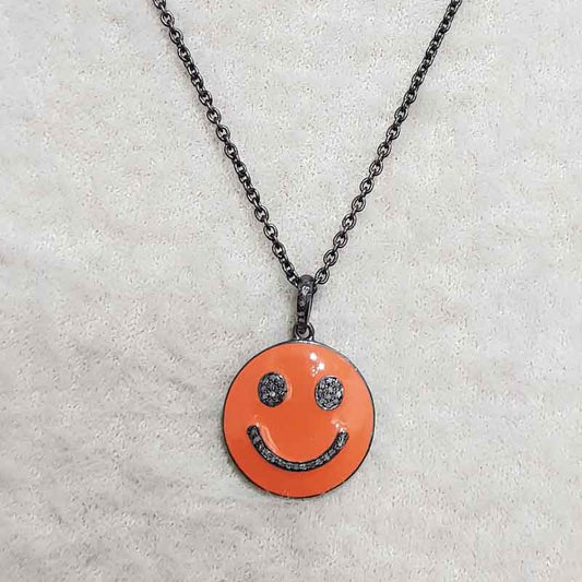 Natural Pave Diamond Emoji Pendant With Orange Enamel, Silver Jewelry, Birthday Gift
