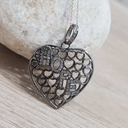 Elegant Two Tone Heart Pendant With Pave Diamond HOPE Layer, Heart Necklace, Silver Jewelry