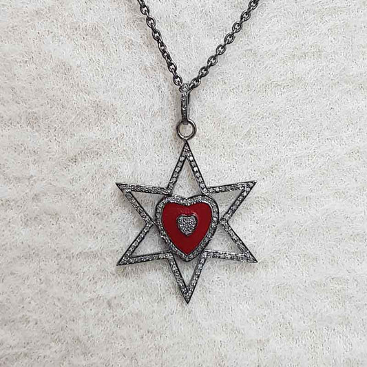 Star With Red Heart Enamel pave Diamond Pendant, Handmade Jewelry, Gift For Someone
