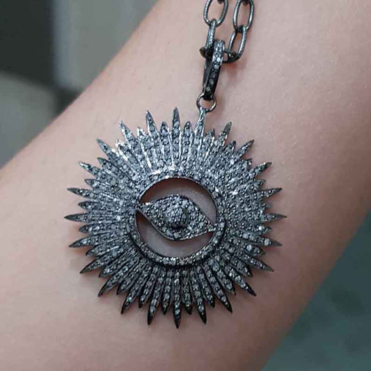 Stylish Fully Pave Diamond Evil Eye Sunburst Pendant, 925 Sterling Silver Pendant, Silver Jewelry