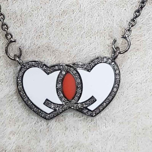 Beautifully Designed Joined Heart Pave Diamond Enamel Pendant, Cutest Gift For Lovers, Valentine's Day Gift