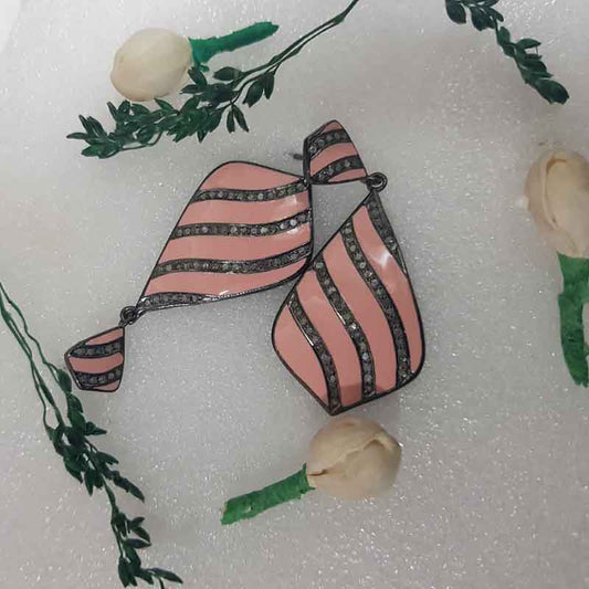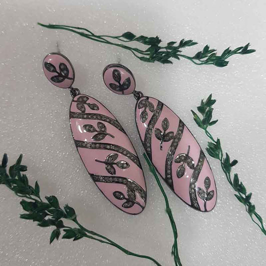 Pink Enamel Beautifully Designed Earrings With Pave Diamond Layers, Silver Jewelry