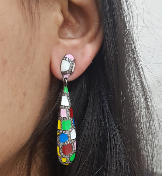 Multi Color Enamel Handmade Designer Pave Diamond Fancy Earrings, Silver Jewelry
